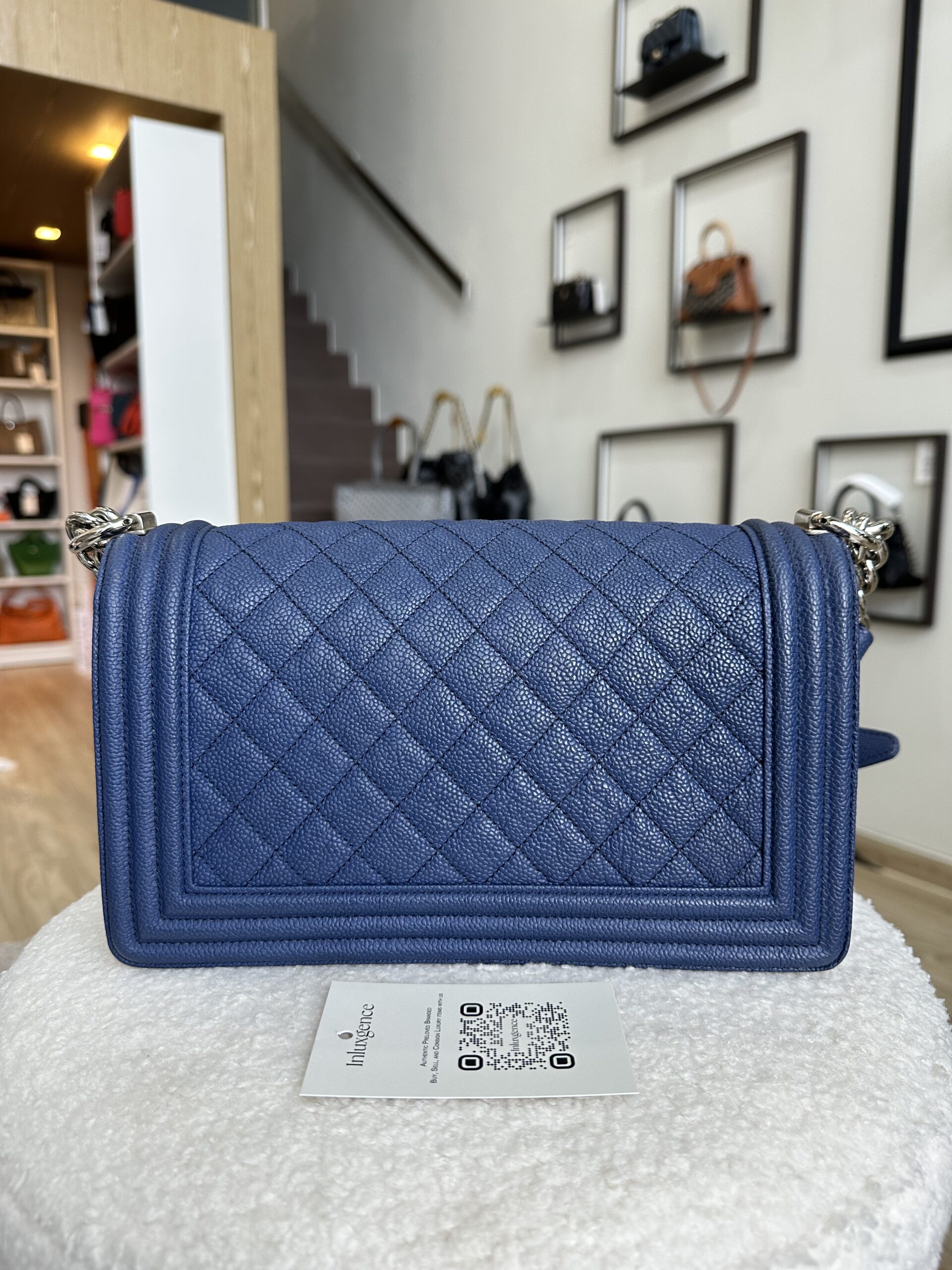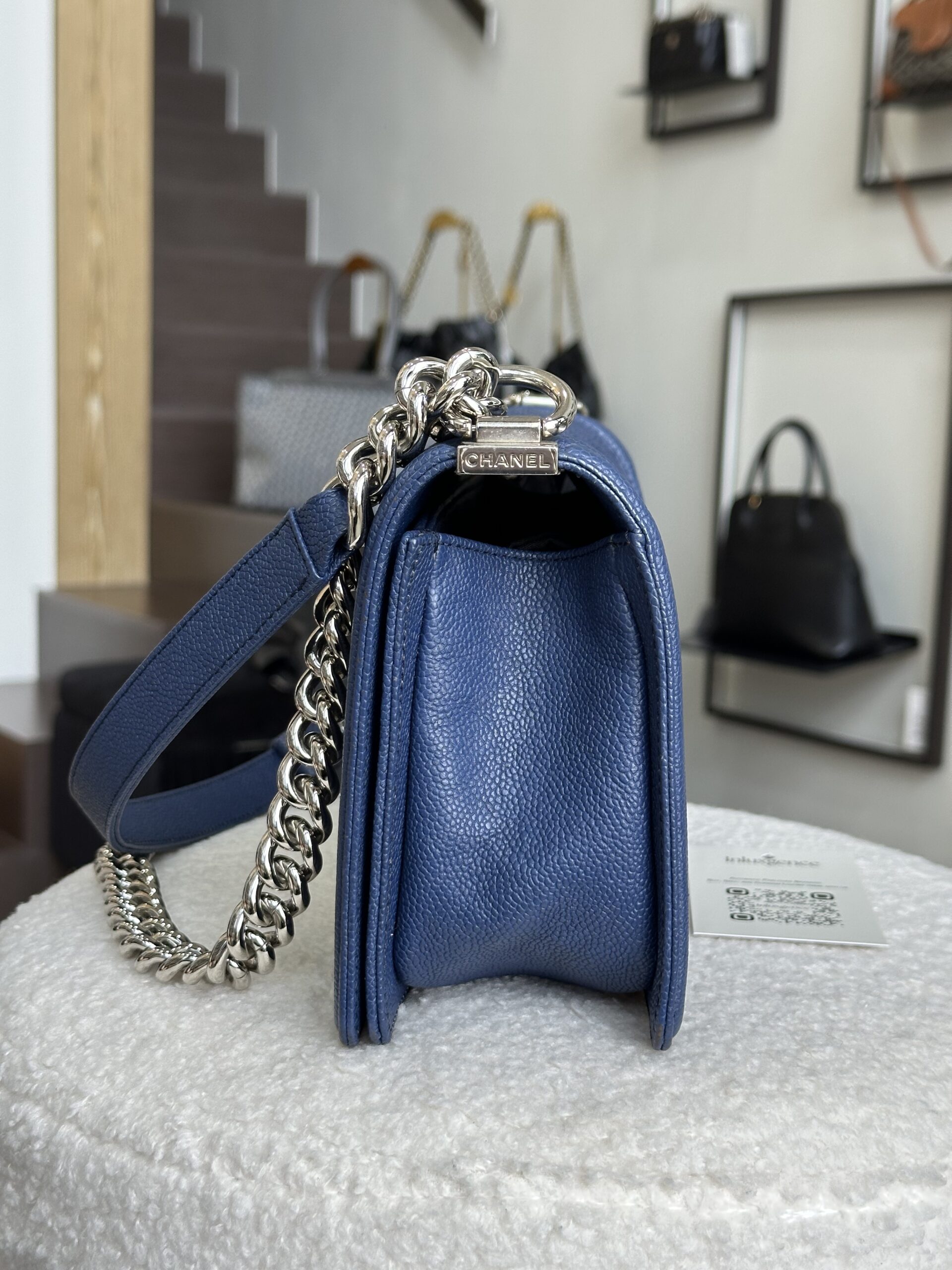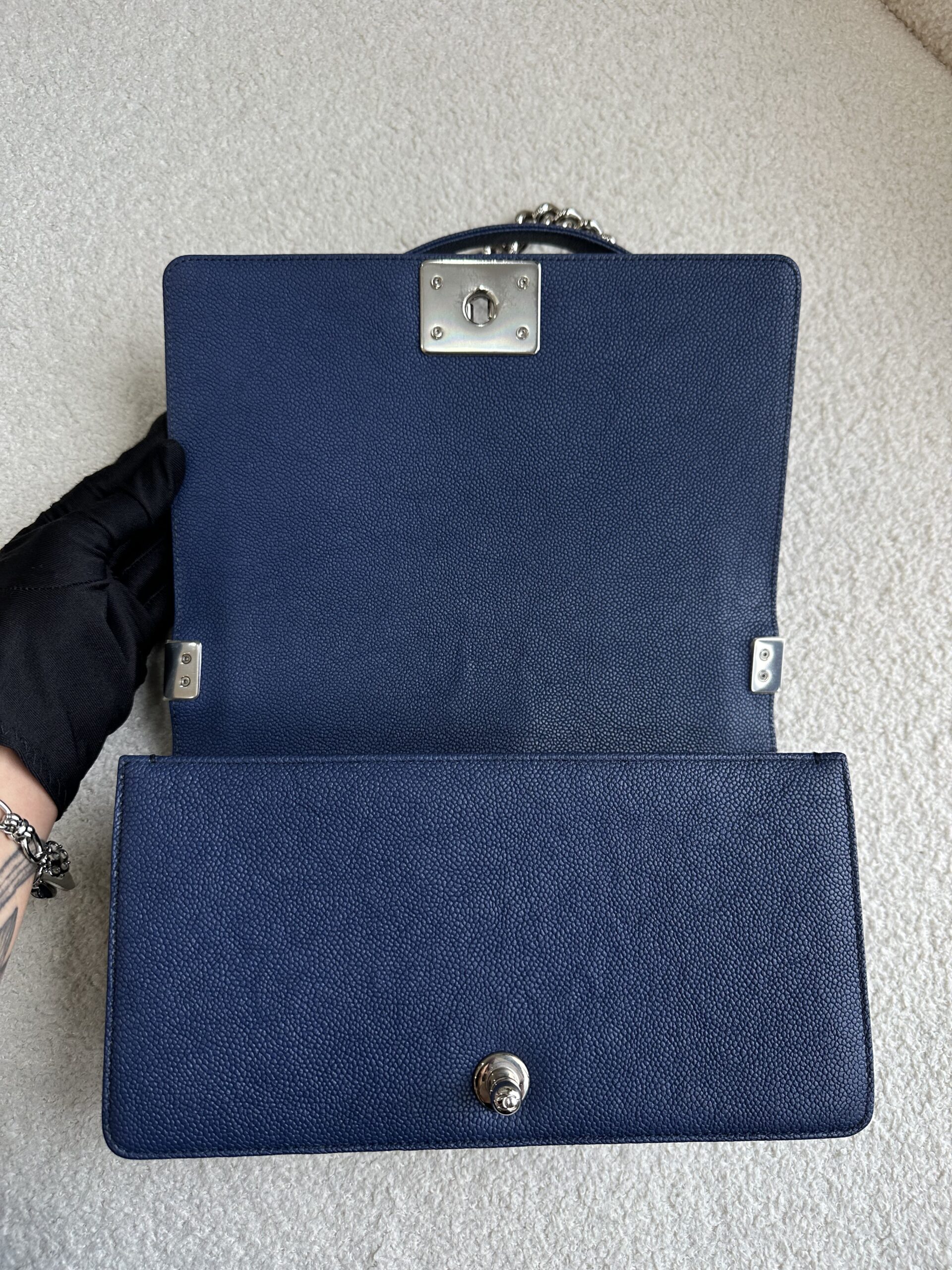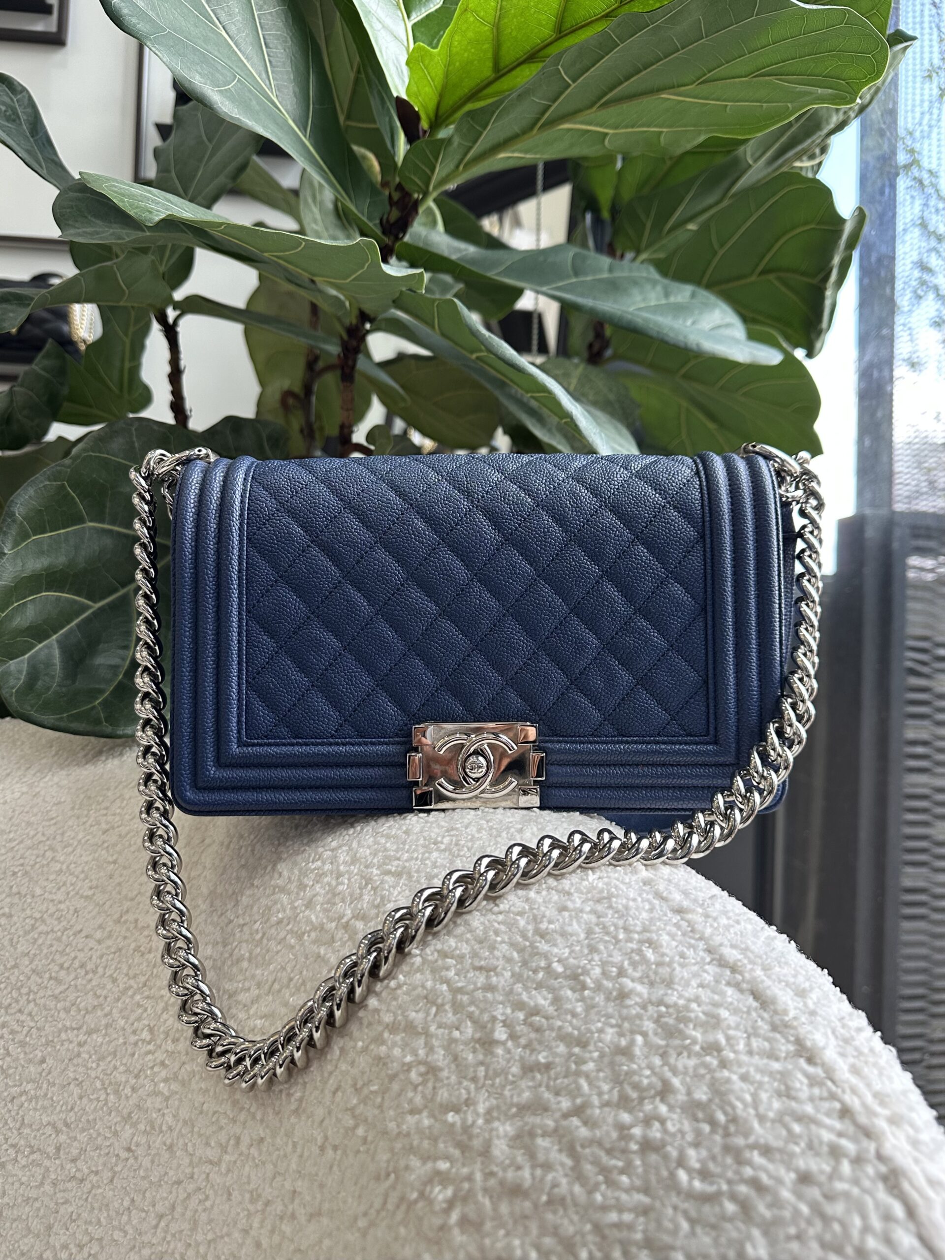 Popular and functional old medium boy in popular caviar with youthful silver hardware 😍✨ An instant classic, this boy is just so polished, edgy, and forever chic! Navy never looked so good 💙🙌🏻