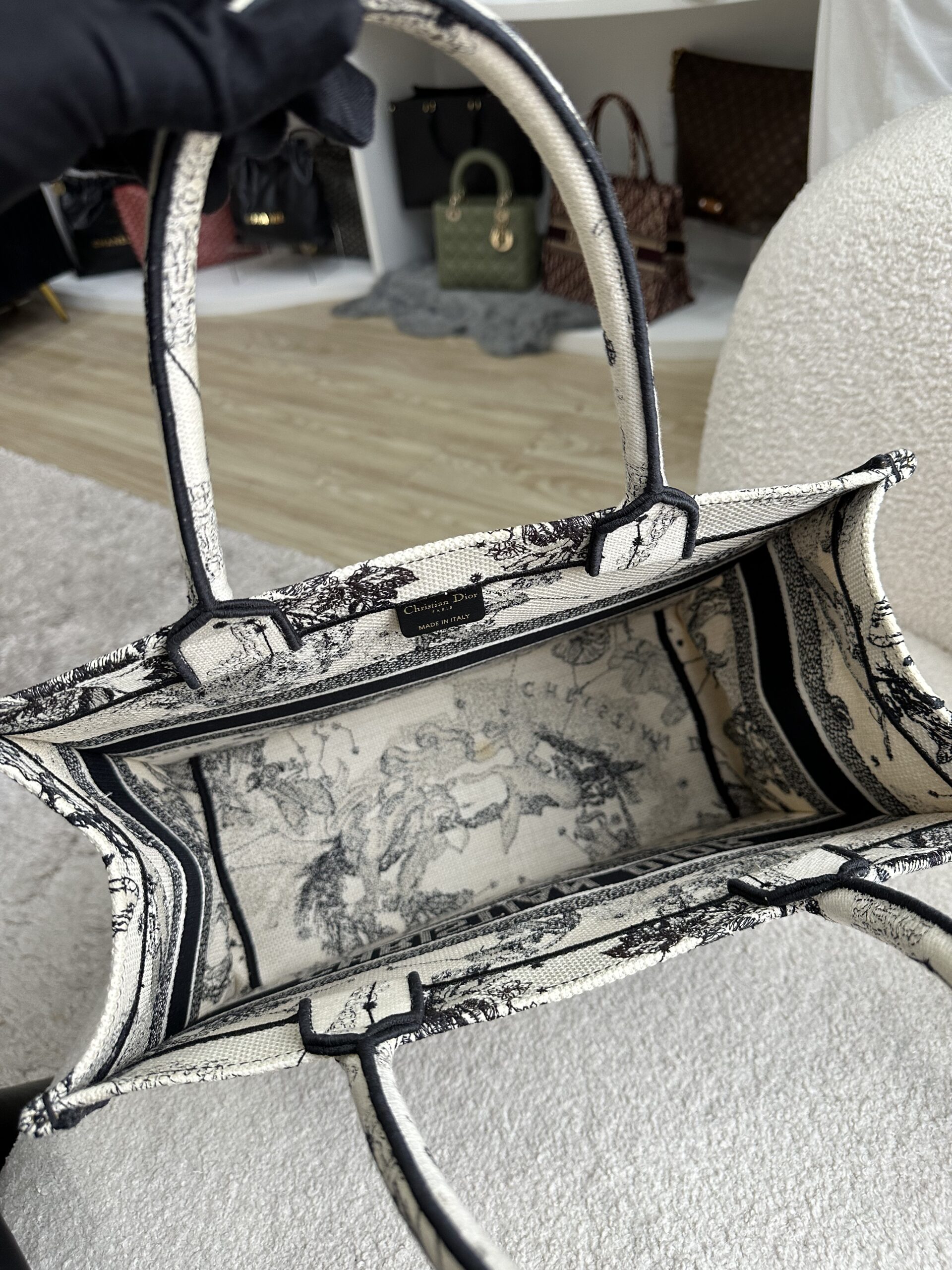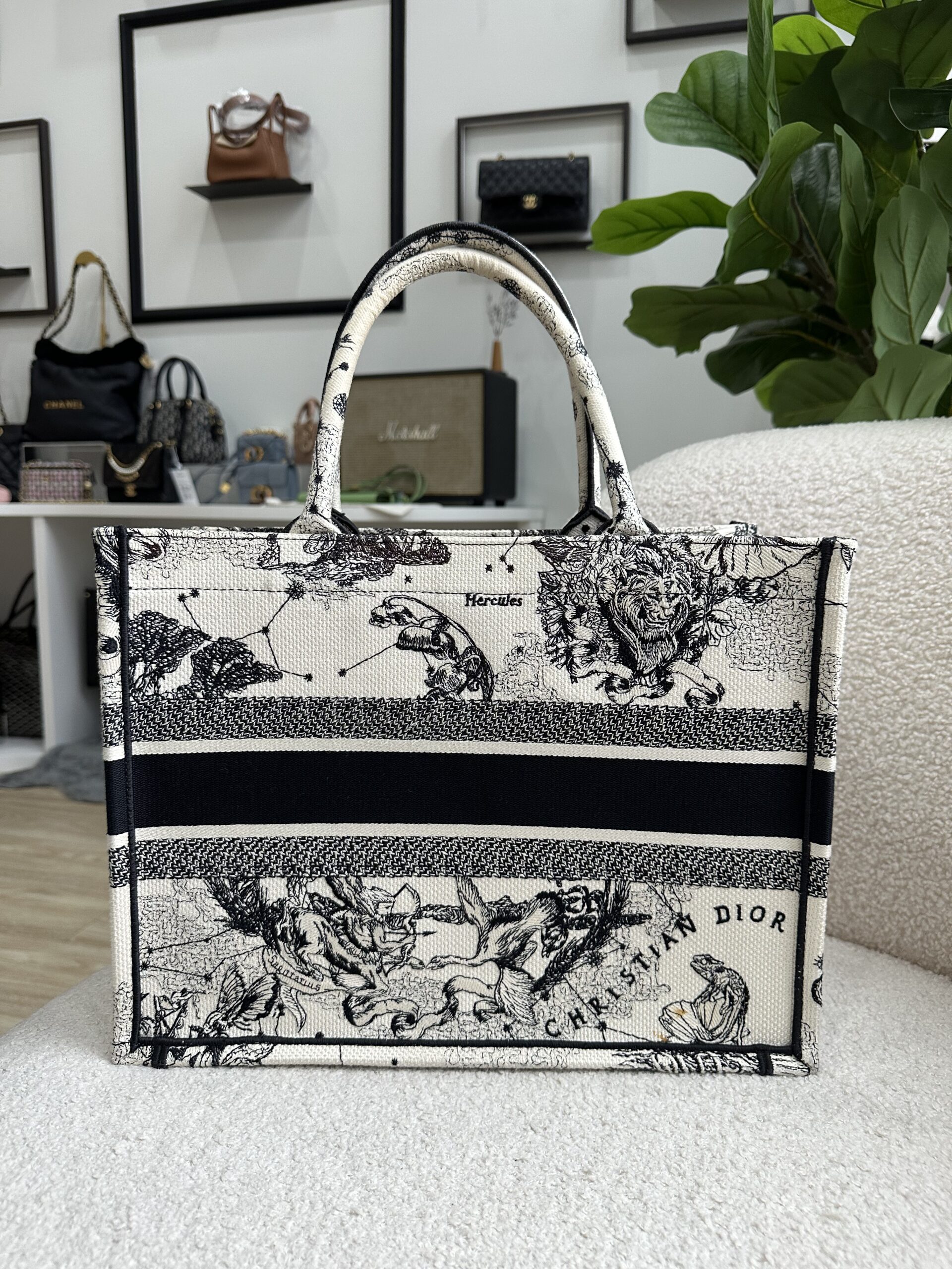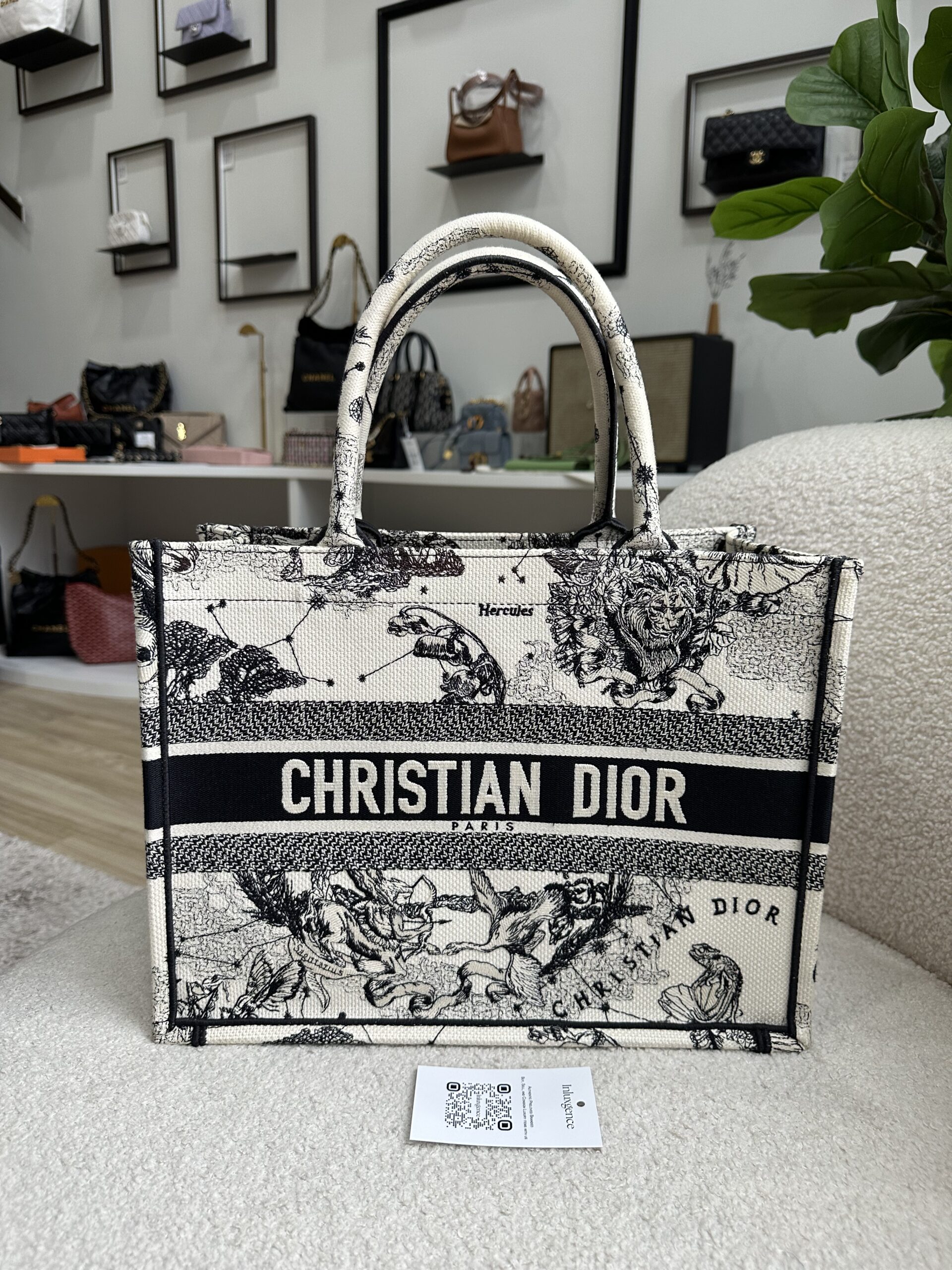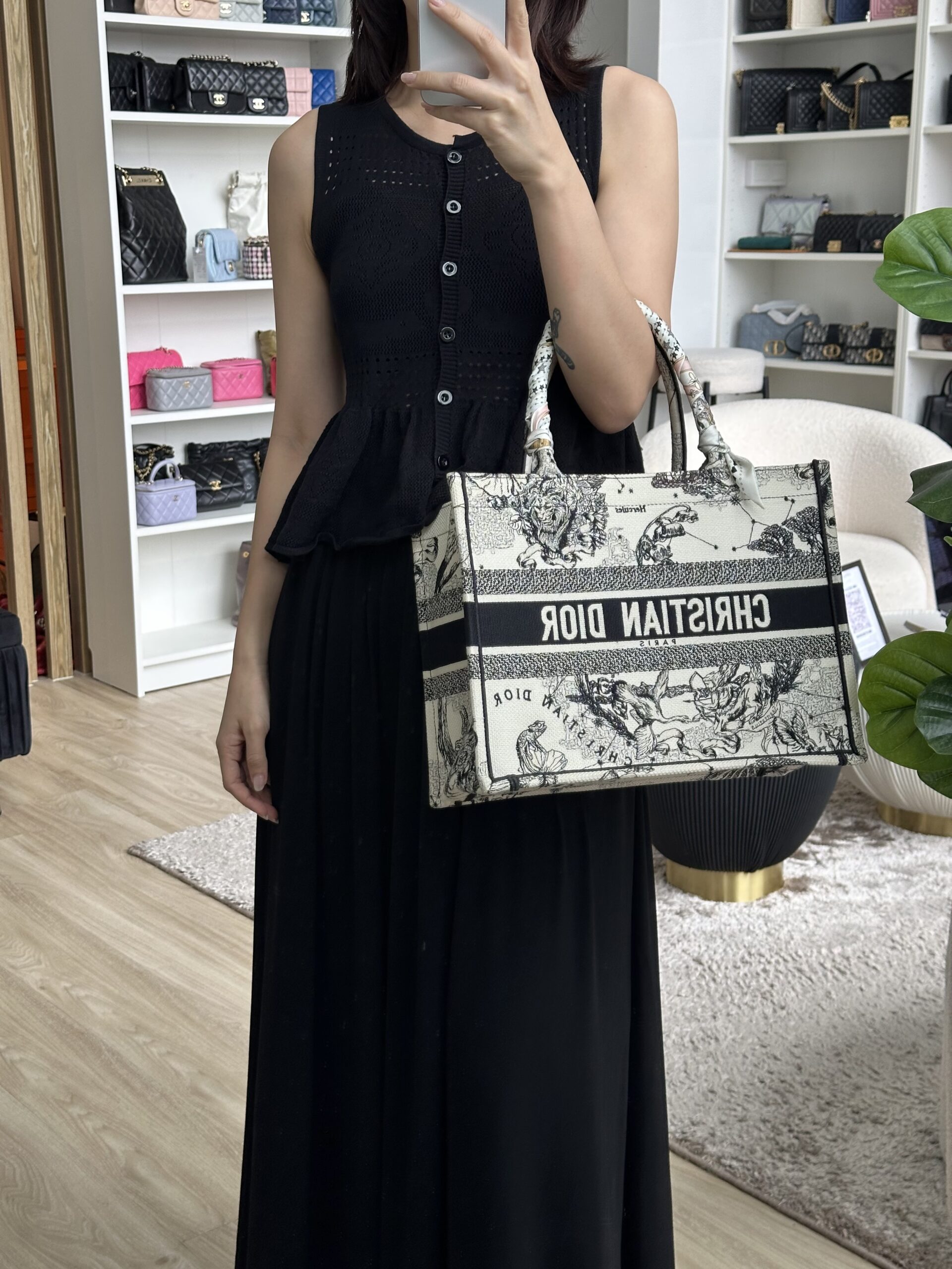 Dior Medium Book Tote Toile De Jouy Embroidery Zodiac Latte/Black with Authentic Twilly