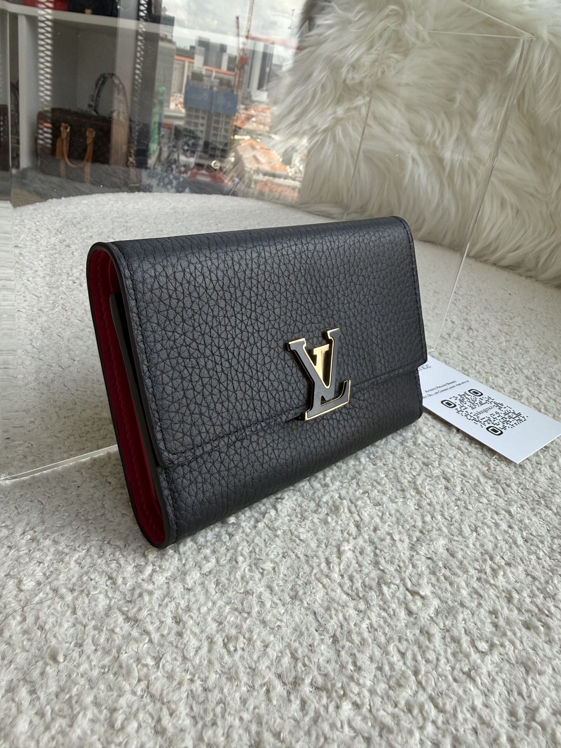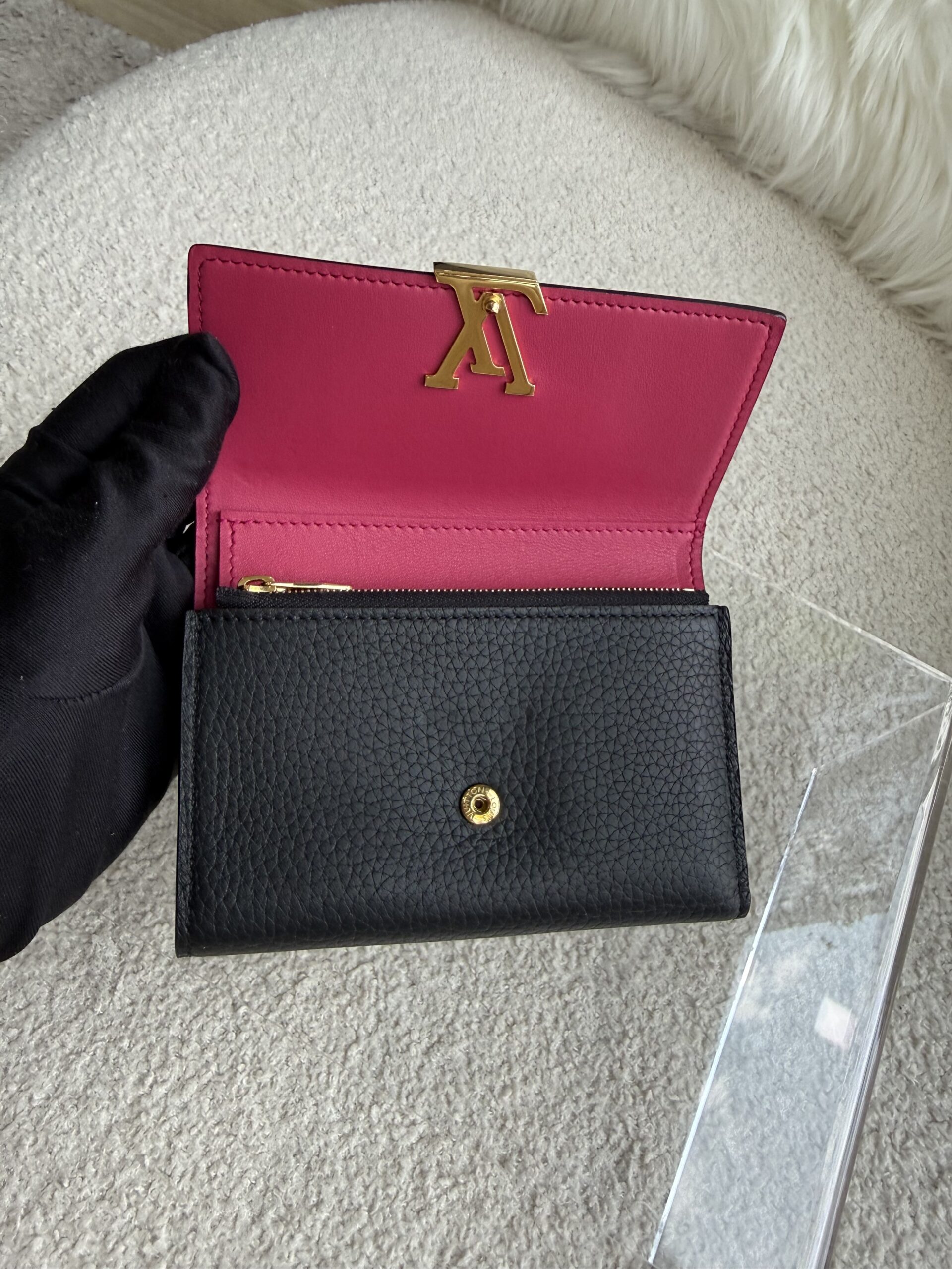 LV Capucines Compact Wallet Taurillon Noir/Rose GHW | ILG5223