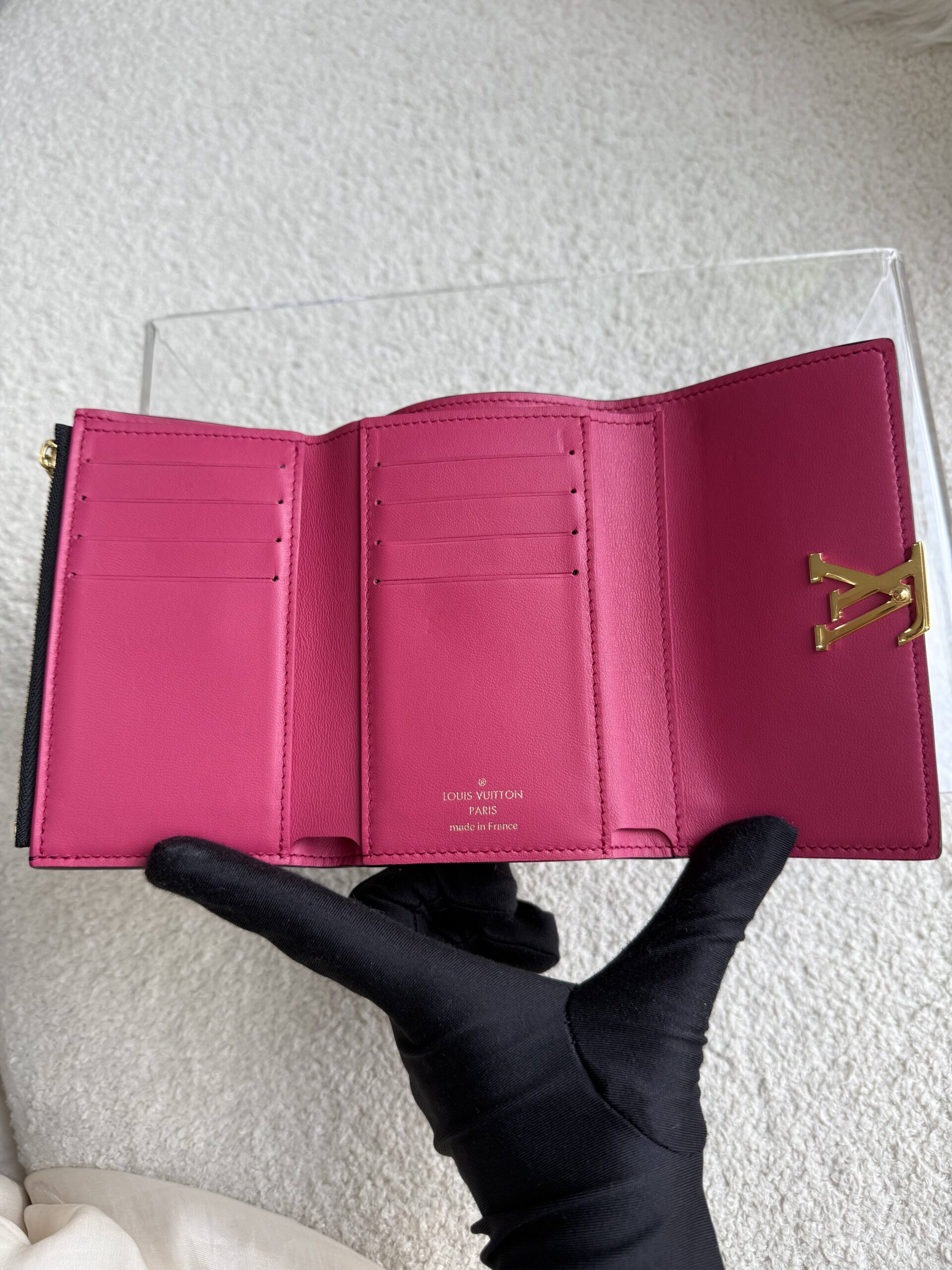 LV Capucines Compact Wallet Taurillon Noir/Rose GHW