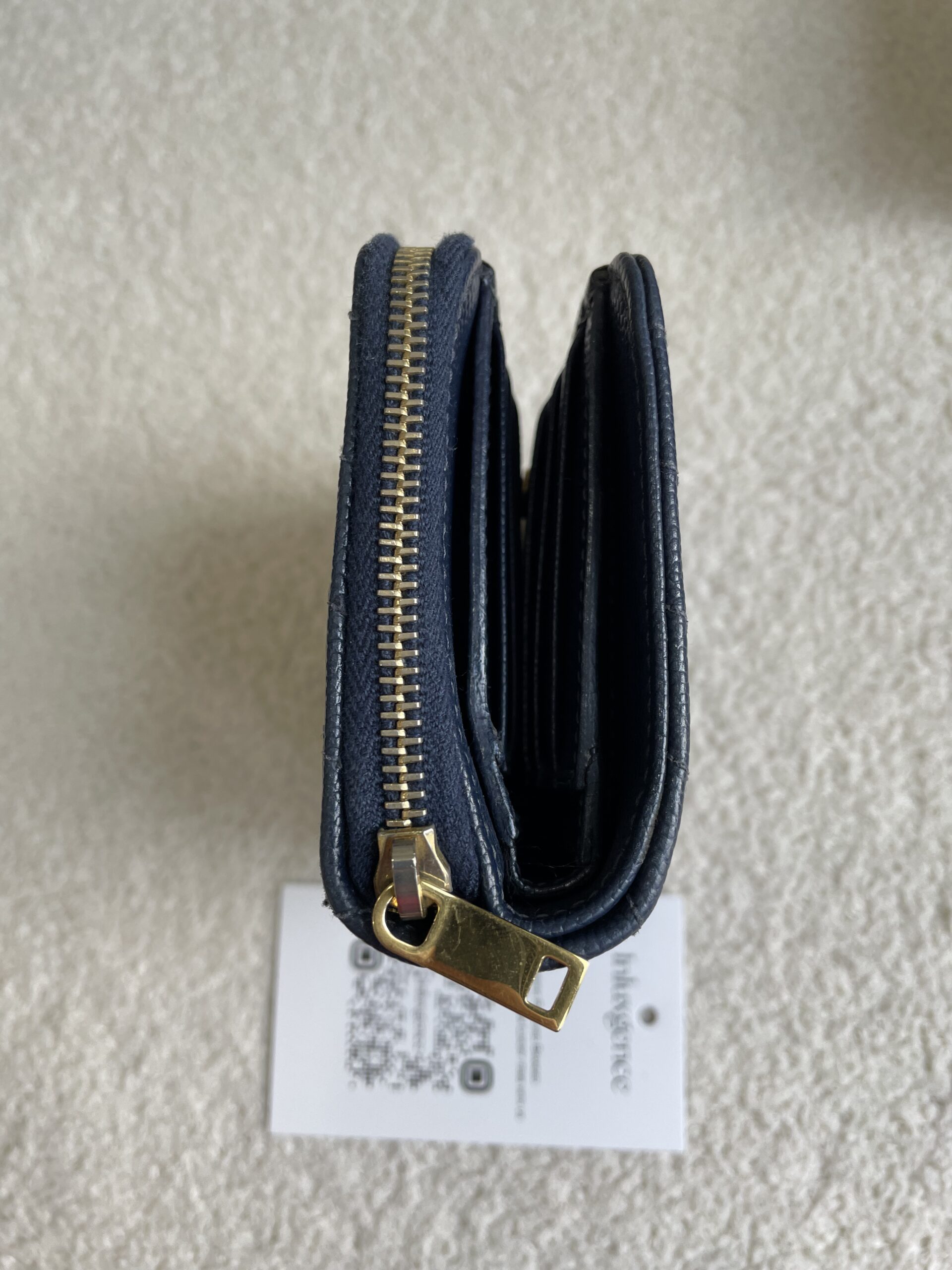 A simple zip compact wallet in blue grained leather. Durable and functional!