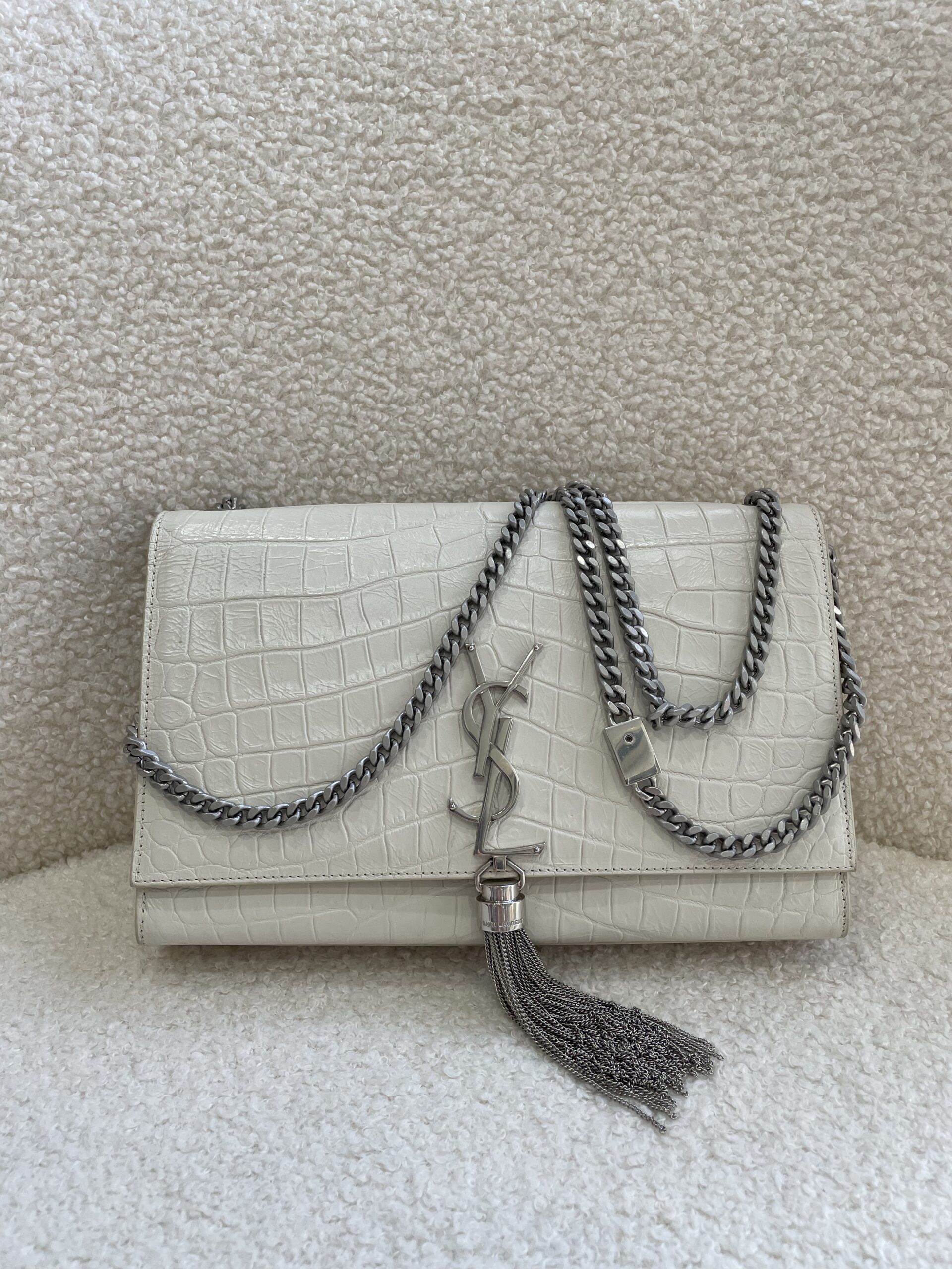 YSL Medium Kate Tassel White Croc Embossed SHW