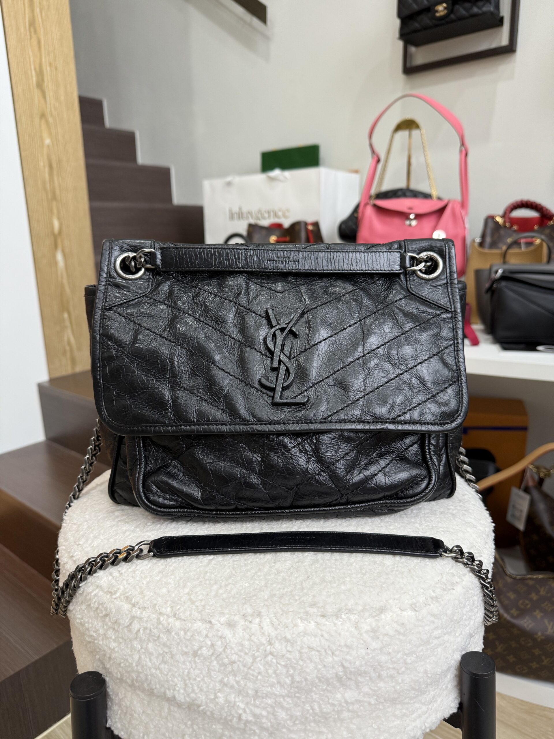 YSL Niki Medium Black Vintage Calfskin in Brushed RHW